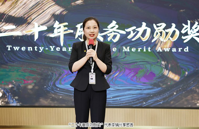 榜樣引領(lǐng)方向,榮耀致敬堅守。大會隆重表彰了2025年度“五年服務(wù)英才獎”、“十年服務(wù)忠誠獎”與“二十年服務(wù)功勛獎”獲得者,向與企業(yè)風(fēng)雨同舟的忠誠員工致以崇高敬意。勞嘉總裁、胡均安常務(wù)副總裁依次為獲獎優(yōu)秀個人頒發(fā)榮譽(yù)獎杯和證書。獲獎代表蔣文、李娟、牛小紅、羅瓊蕾深情分享與綠之韻共同成長的心路歷程,她們以歲月為筆,以實干為墨,生動詮釋了“擇一事終一生”的執(zhí)著與熱愛,為企業(yè)文化注入了深厚而溫暖的底蘊(yùn)。