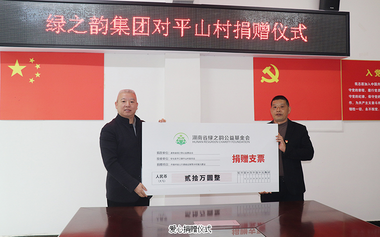 隨后的捐贈(zèng)儀式上,綠之韻集團(tuán)常務(wù)副總裁胡均安代表基金會(huì)向平山村捐贈(zèng)20萬(wàn)元愛心支票用于支持村級(jí)公共基礎(chǔ)設(shè)施建設(shè)。平山村黨支部書記梁建雄代表全村接收捐贈(zèng),并向綠之韻回贈(zèng)了飽含感激之情的愛心錦旗。胡均安常務(wù)副總裁表示,作為一名安化籍企業(yè)家,同時(shí)也是一名安化縣人大代表,積極投身到建設(shè)家鄉(xiāng)的事業(yè)中去,是他與生俱來的責(zé)任與使命。綠之韻先后在安化投資建設(shè)黃精、杜仲等中藥材種植基地,捐建水電、道路、橋梁、生活廣場(chǎng)等硬件設(shè)施,為老人、婦女進(jìn)行免費(fèi)的兩癌篩查,為學(xué)校捐建校車、圖書、體育設(shè)備,為孩子們?cè)O(shè)立獎(jiǎng)教獎(jiǎng)學(xué)金,累計(jì)捐贈(zèng)款物1000多萬(wàn),全方位支持家鄉(xiāng)鄉(xiāng)村振興建設(shè)、文化教育事業(yè)發(fā)展。今年5月20日,綠之韻集團(tuán)在長(zhǎng)沙人文地標(biāo)橘子洲舉行3000人綠跑大型公益品牌活動(dòng),現(xiàn)場(chǎng)捐贈(zèng)100余萬(wàn)元愛心款項(xiàng)至綠韻圓夢(mèng)公益項(xiàng)目。其中,捐贈(zèng)20萬(wàn)用于平口鎮(zhèn)平山村村級(jí)公共設(shè)施項(xiàng)目建設(shè),促進(jìn)鄉(xiāng)村振興建設(shè)及當(dāng)?shù)亟?jīng)濟(jì)發(fā)展,提高家鄉(xiāng)人民的幸福感、獲得感、滿足感。此次,帶領(lǐng)綠之韻集團(tuán)黨委一行來到安化共聯(lián)共建,也希望盡己所能,將企業(yè)發(fā)展成果惠及家鄉(xiāng)人民,為建設(shè)新時(shí)代高質(zhì)量、富饒美麗的安化貢獻(xiàn)一份力量。